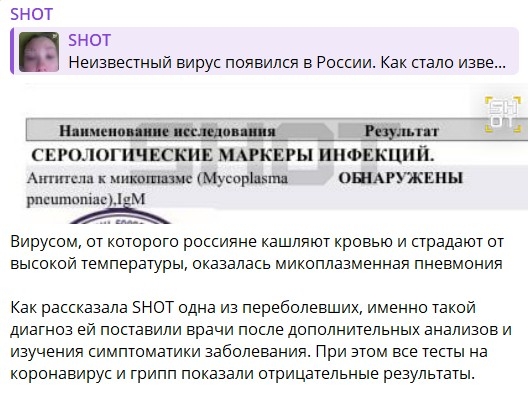 Telegram-канал, первым распространивший эту информацию, сегодня опубликовал медицинское заключение, которое, по их словам, предоставила пациентка. В документе указано, что при обследовании выявили бактерии Mycoplasma pneumoniae.